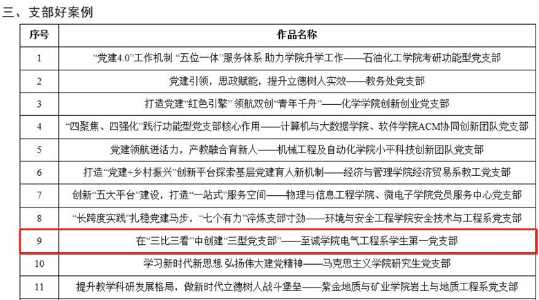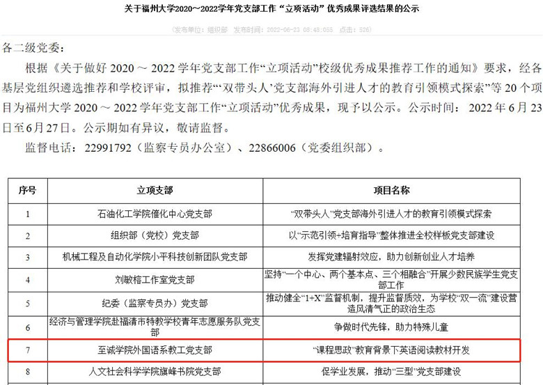 日前,在福州大学组织的党建工作成果评比中,成人网 多项成果喜获佳绩。其中,在福州大学第四批“三个好”优秀成果评比中,成人网 党委选送党课《中共中央关于党的百年奋斗重大成就和历史经验的决议中的“大历史观”》(主讲人:成人网-免费国产色情网站 马克思主义学院院长、马克思主义学院教工党支部书记 郭伟)入选“书记好党课”;党支部案例《在“三比三看”中创建“三型党支部”》(成人网-免费国产色情网站 电气工程系学生第一党支部)入选“支部好案例”。在福州大学2020~2022学年党支部工作“立项活动”优秀成果评选中,成人网 党委选送的党支部工作项目《“课程思政”教育背景下英语阅读教材开发》(成人网-免费国产色情网站 外国语系教工党支部)获福州大学2020~2022学年党支部工作“立项活动”优秀成果。