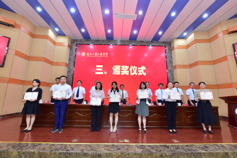 陈为旭院长在表彰大会上讲话,他向全院教职员工致以了节日的问候,向受到表彰的先进个人和新聘为高级专业技术职务的同志们表示了祝贺。他指出,过去两年多来,全院教职员工忠诚党的教育事业,不忘立德树人初心,牢记为党育人为国育才使命,在各自平凡的岗位上作出了不平凡的业绩,推动学院有特色高水平应用型大学建设取得新成效。他代表学院党政对全院教职员工的奉献与付出表示感谢。他希望学院全体教职员工:一要坚定理想信念,做筑梦之师;二要坚持立德树人,做品行之师;三要潜心治学科研,做学问之师;四要坚守教育初心,做仁爱之师;五要严守纪律底线,做廉洁之师。他号召全院教职员工,站在新时代的起点,在各自岗位上勇立潮头、敢于担当,不忘初心、砥砺前行,以昂扬的锐气、蓬勃的朝气继续谱写学院有特色高水平应用型大学建设的崭新篇章,以优异的成绩迎接党的二十大胜利召开!