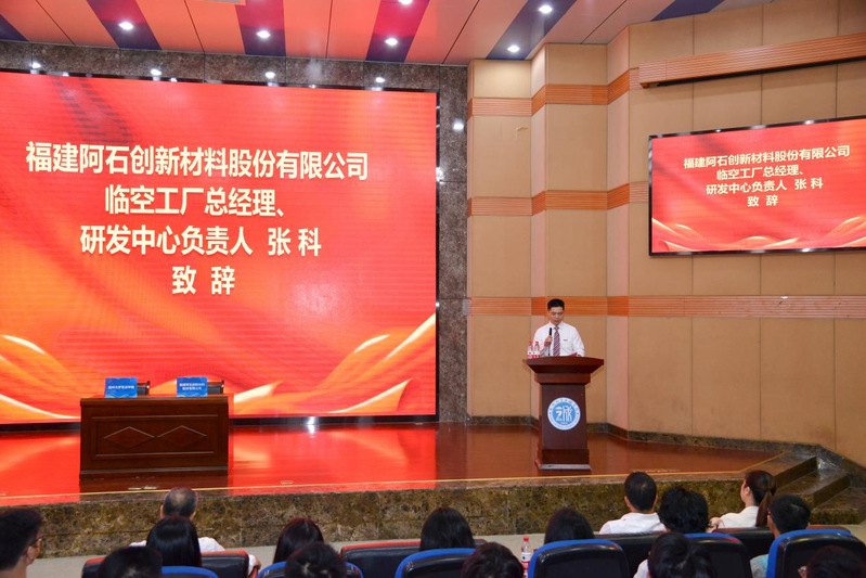 在材料工程系师生们的见证下,院长陈为旭、校友张科作为校企双方代表签署了产学研战略合作意向书。院党委常务副书记何希耕在仪式上致辞,表示学院与阿石创建立战略合作伙伴关系,是学院着力提高应用型人才培养质量的重要举措,也是企业发挥资源优势和市场优势反哺高校、推动教育事业发展的积极行动。希望校企双方进一步深化产教融合,推动校企合作共赢。张科校友在仪式上介绍了自身经历、公司基本情况及未来发展战略规划,表示很高兴与母校达成合作,希望在今后实现校企双方优势互补、资源共享、合作共赢。