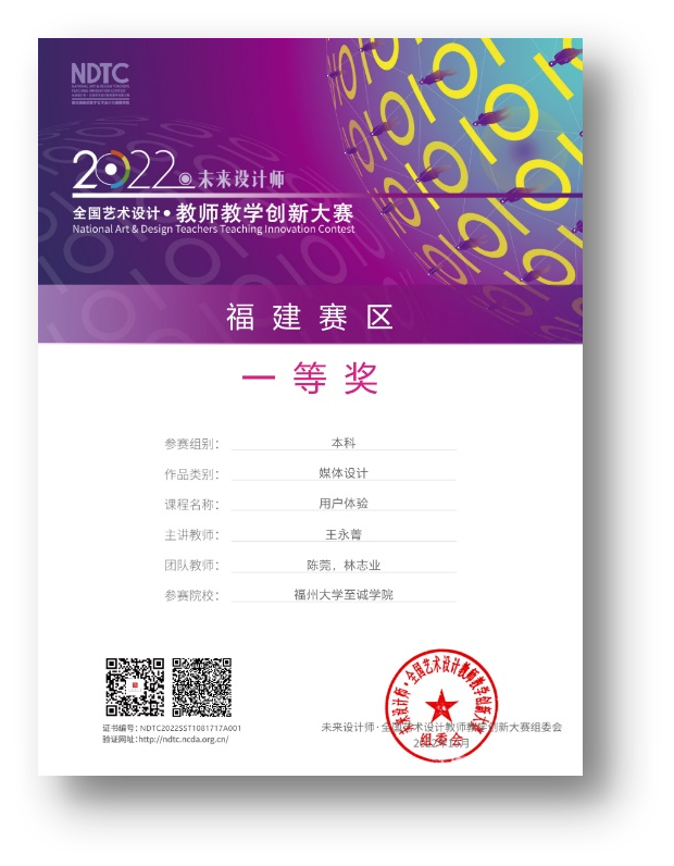 日前,2022未来设计师·全国艺术设计教师教学创新大赛公布了全国总决赛获奖名单,成人网 网络与新媒体专业王永菁老师(团队教师:陈莞、林志业、郭越)的课程《用户体验》(A类-媒体设计类赛道),在获得福建省赛区一等奖后,作为福建省唯一的队伍晋级全国总决赛,经过答辩,最终夺得全国二等奖。