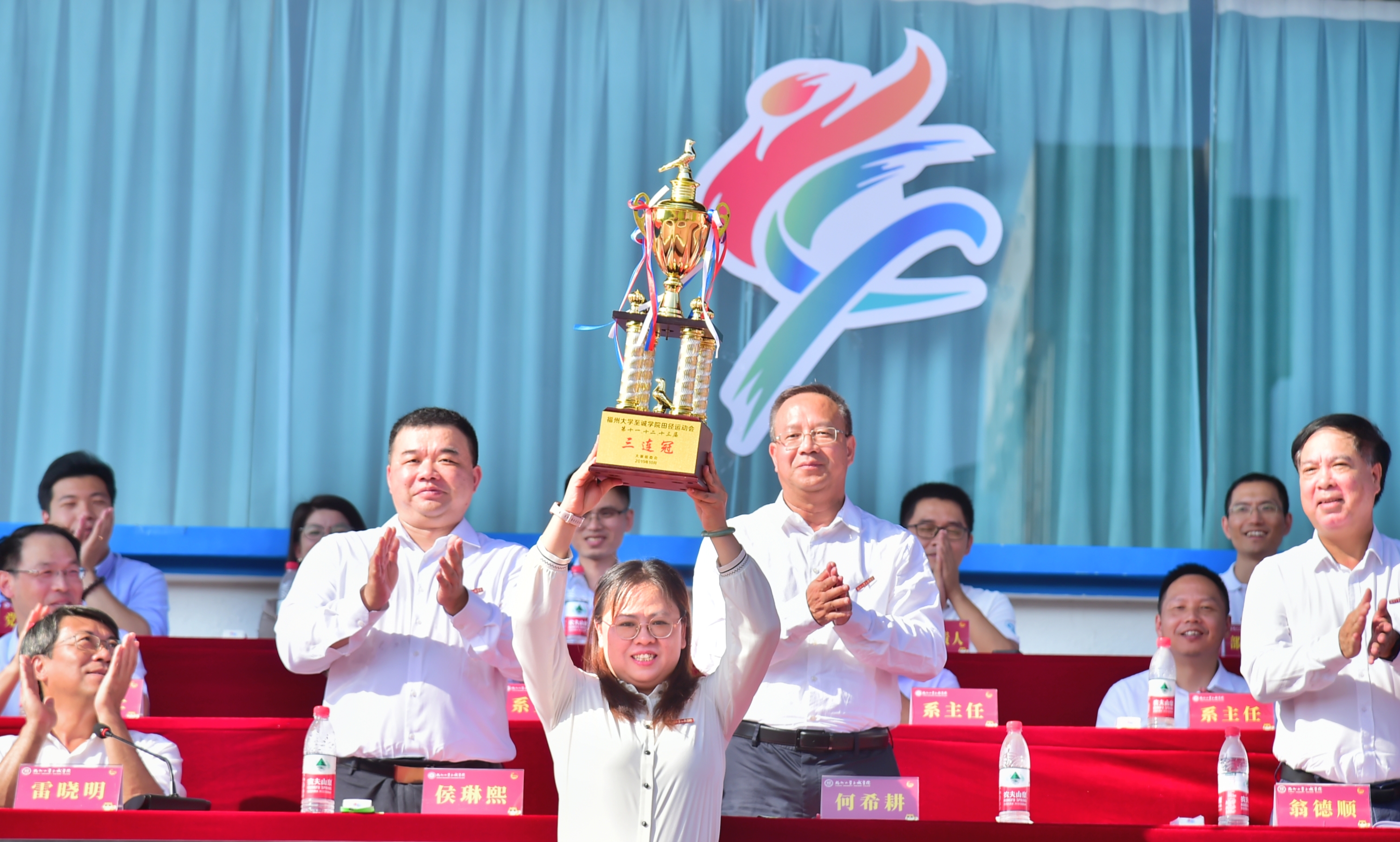 随后,侯琳熙院长、何希耕常务副书记为土木工程系颁发“三连冠”纪念奖杯,表彰他们坚韧的体育精神和出色的竞技能力,鼓励全院同学向他们学习。裁判员代表何语林老师、运动员代表朱宇杰同学随后相继上台宣誓。