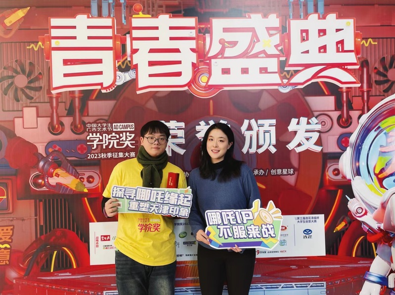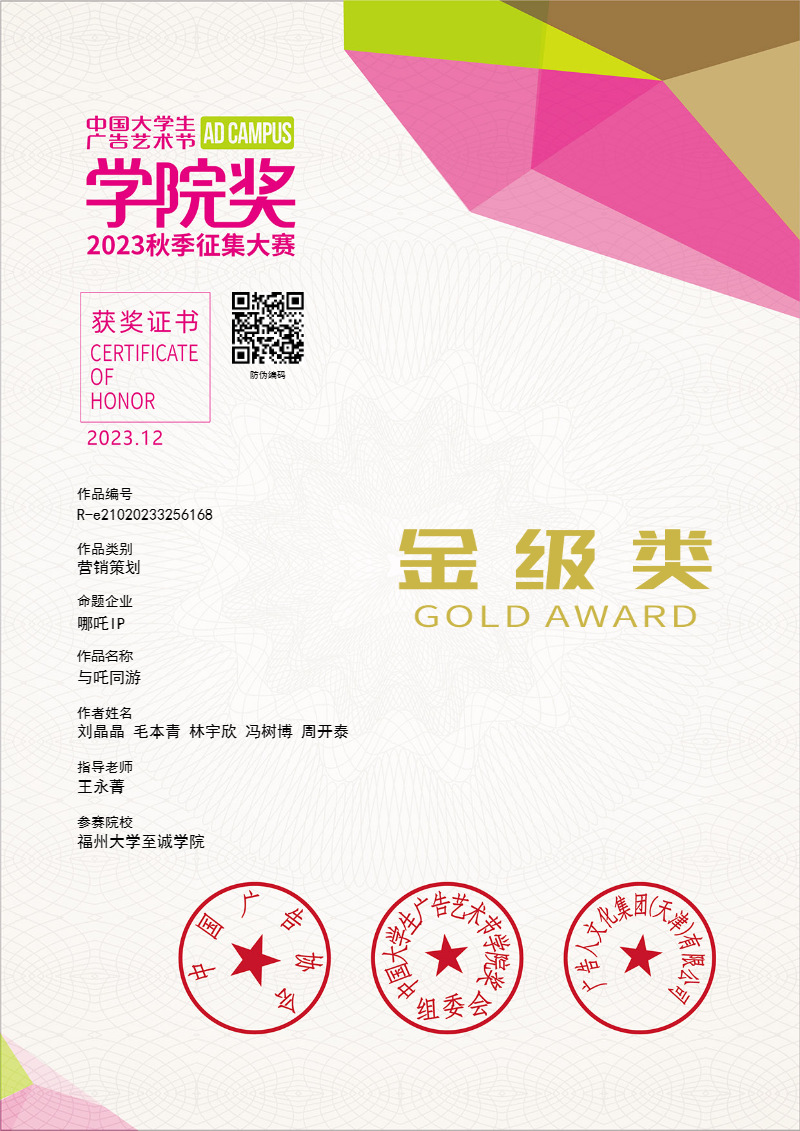 2023年12月22日,“2023中国大学生广告艺术节学院奖青春盛典”颁奖典礼在北京广播大厦举行,成人网 传媒与设计系学生刘晶晶、毛本青、林宇欣、冯树博、周开泰的作品《与吒同游》在现场斩获金级奖(赛道第一/唯一)的优异成绩。 本届学院奖有来自中国传媒大学、上海大学、厦门大学等上千所院校参赛,超过150万名师生直接参赛,收到来自全国各高校学子的40多万件创意作品。其中“哪吒IP——天津城市文旅品牌青年设计大赛”赛道为唯一的城市命题,共收到来自全国的5057组6508件创意作品,成人网 学生在现场揭晓等级奖项的颁奖典礼中喜获营销策划类唯一金级奖。 学院奖由中国广告协会主办,是中国大学生广告艺术节中的核心项目。1999年创办至今,大赛已走过25个年头,中国大学生广告艺术节“学院奖”是国家级别,且目前国内唯一由国家工商总局批准、中国广告协会主办的大学生广告艺术赛事活动,列入《2023全国普通高校大学生竞赛分析报告》观察目录。赛事在中国传播与广告相关专业院校、学生中间具有广泛的影响力。传媒与设计系网络与新媒体专业学生在课程《广告设计》中积极参与赛学并行,最终获得金级奖1项、企业优秀奖1项、优秀奖13项、入围奖84项,王永菁老师获金级奖指导教师称号,传媒与设计系获得优秀组织院校奖。