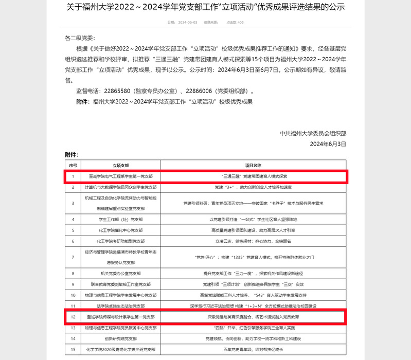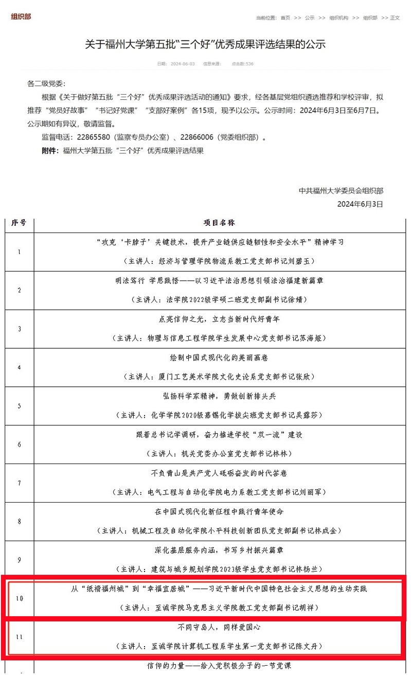 日前,福州大学党委公示《福州大学第五批“三个好”优秀成果评选结果》和《福州大学2022~2024学年党支部工作“立项活动”优秀成果评选结果》,成人网 有4项成果入选优秀成果,是历年来最好成绩。