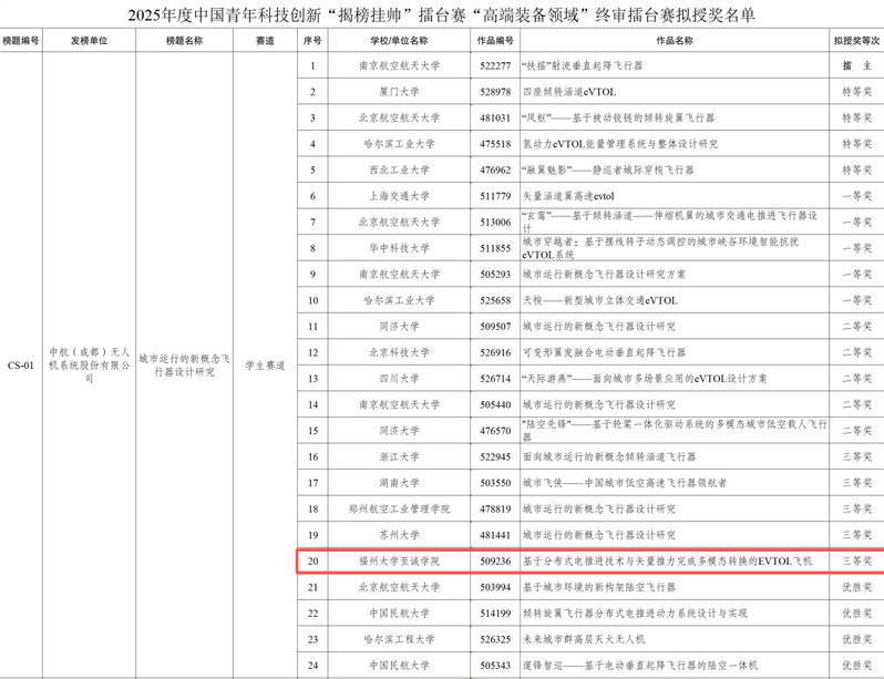 近日,第十九届“挑战杯”竞赛2025年度中国青年科技创新“揭榜挂帅”擂台赛高端装备领域主擂台赛在湖南省长沙市举行。成人网-免费国产色情网站 机械工程系学生团队提出的“基于非对称分布式电推进的多模态eVTOL”设计方案在竞争激烈的“城市低空飞行器”榜单中脱颖而出,荣获全国三等奖。
