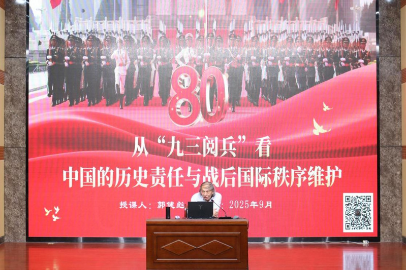 开班仪式后,郭健彪教授以《从“九三阅兵”看中国的历史责任与战后国际秩序维护》为题为同学们进行第一次理论学习授课。他围绕中国人民抗日战争伟大胜利是一个重大历史转折点、当今世界格局与国际秩序的博弈及维护战后国际秩序、为全球事务提供“中国方案”几个方面展开详细讲解。